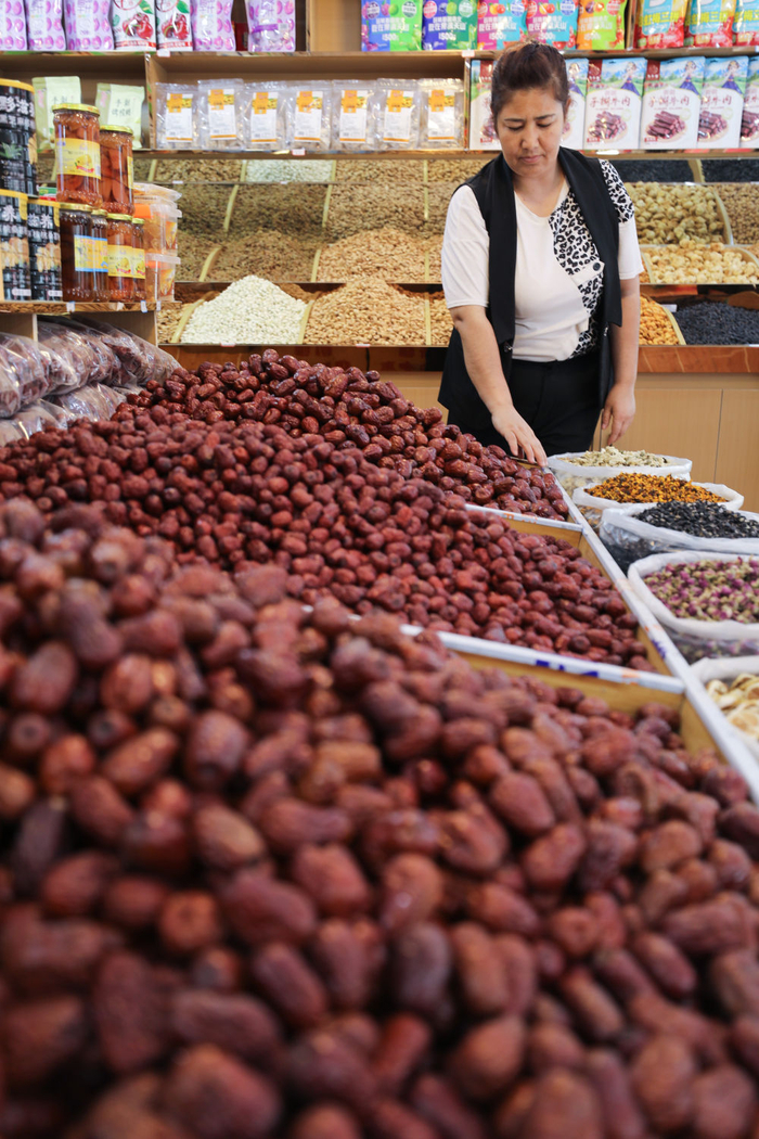 在和田北慕市场,一家干果铺的工作人员在整理和田产的枣。