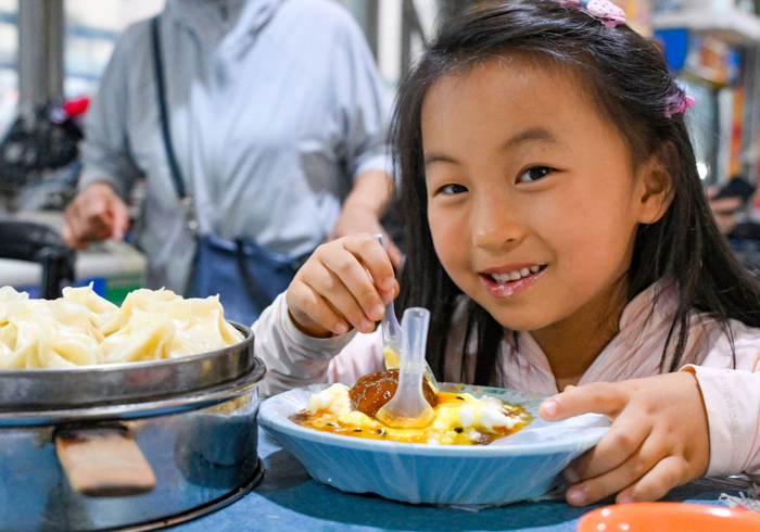 来自上海的小朋友在和田夜市品尝酸奶粽子。