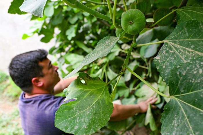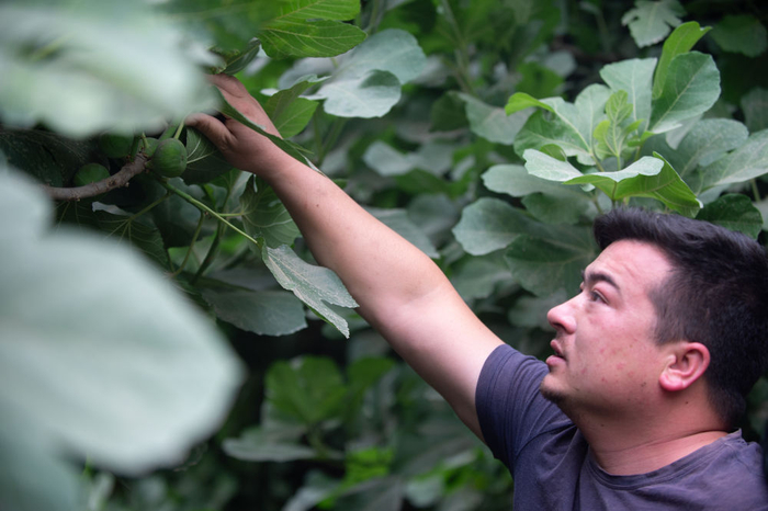 和田县拉依喀乡夏普吐鲁艾日克村村民在查看自家种植的无花果长势。