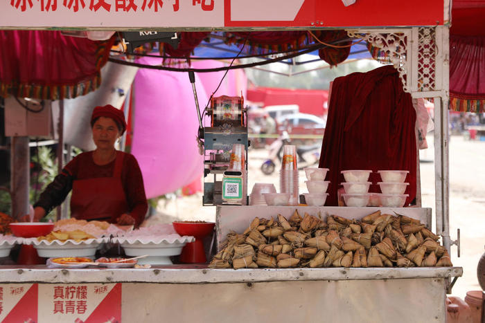 在和田县布扎克乡农贸市场举行的巴扎上,商户在卖粽子。