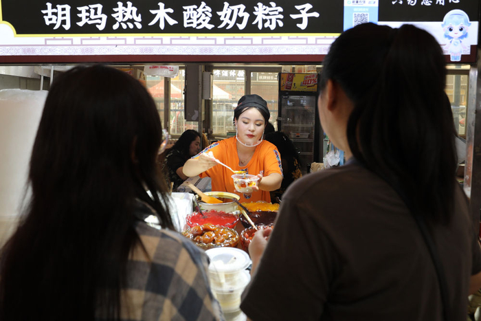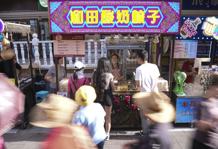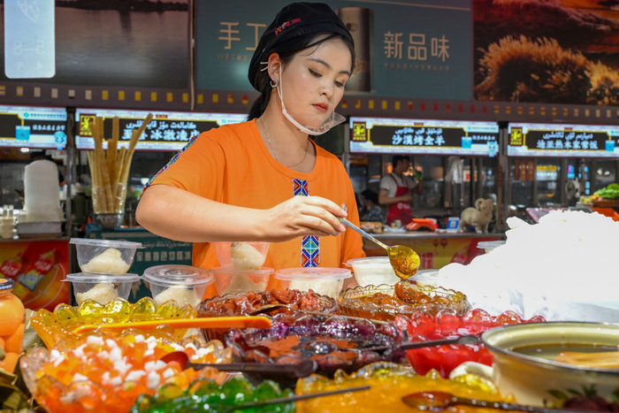 人们在位于乌鲁木齐市的大巴扎美食街品尝酸奶粽子。
