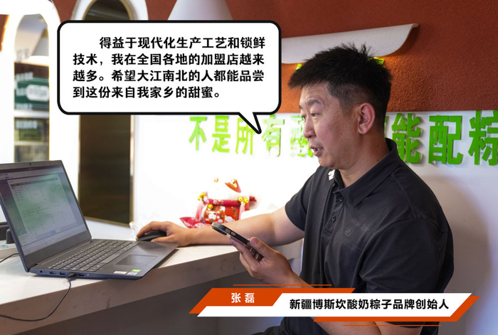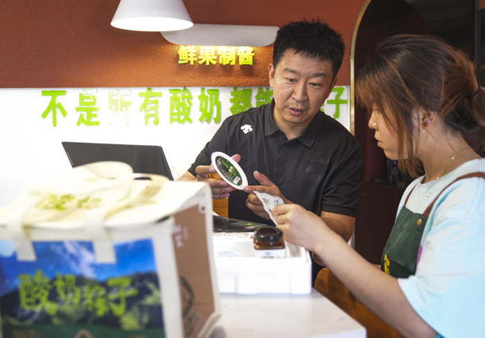 在乌鲁木齐,博斯坎酸奶粽子品牌创始人张磊(左)在门店与工作人员沟通如何搭配礼盒内容。