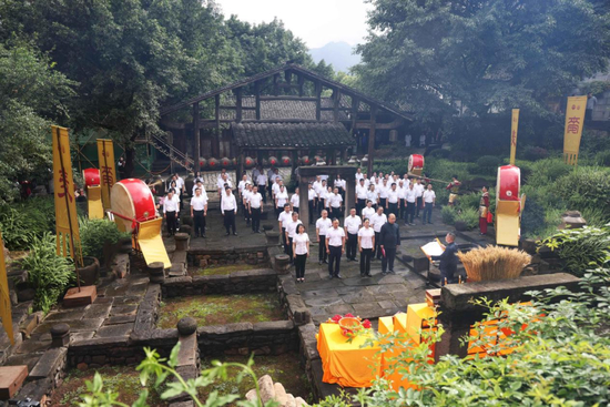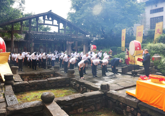 端午赤浪,重阳碧波。端午时节,随着降水增多,赤水河由原本的碧绿转为赤红,河畔的“茅酒之源”(制酒一车间)生产房内,茅台酒四轮次生产如火如荼。比邻生产房的“茅酒之源”酿酒工业遗产群无声诉说着茅台酒酿制技艺的厚重,也见证了茅台不断壮大的历史。遗产群中心的遗址广场上旌旗猎猎、鼓号阵阵,在庄重肃穆的氛围里,参敬人员整齐列队,恭敬等候仪式开始。