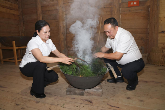 茅台酒酿酒工业遗产群——“荣和”烧房干曲仓旧址,是茅台现存最早的曲仓。仪式上,彭朝、任金素共同点燃柏香树枝、艾草进入曲仓行熏仓之礼,以安镇土地,驱虫消毒。