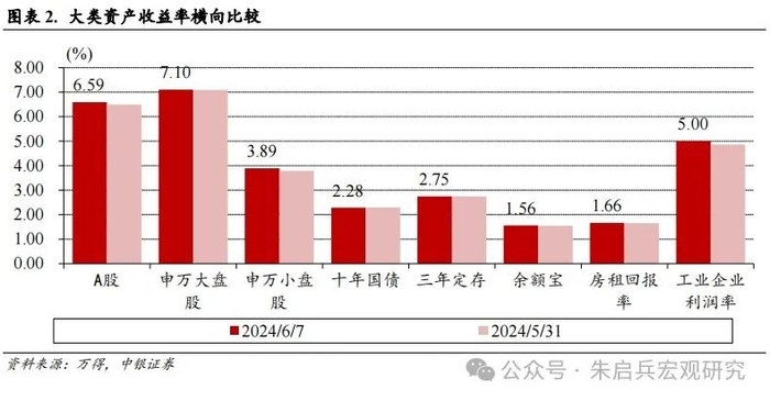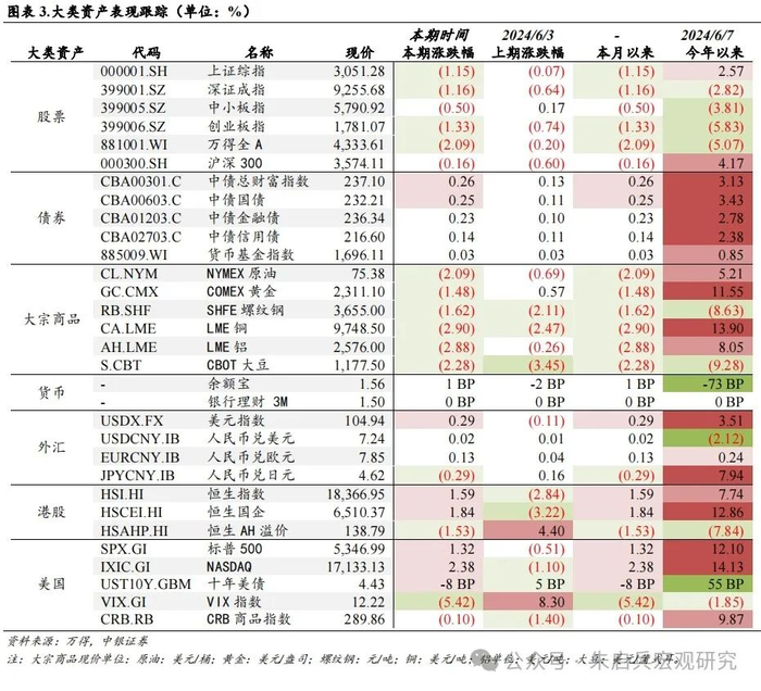 美元指数走强,全球非美元风险资产价格出现调整。股市方面,本周A股指数普跌,跌幅较小的指数是沪深300(-0.16%),领跌的指数是万得全A(-2.09%);港股方面恒生指数上涨1.59%,恒生国企指数上涨1.84%,AH溢价指数下行1.53%收于138.79;美股方面,标普500指数本周上涨1.32%,纳斯达克上涨2.38%。债市方面,本周国内债市普涨,中债总财富指数本周上涨0.26%,中债国债指数上涨0.25%,金融债指数上涨0.23%,信用债指数上涨0.14%;十年美债利率下行8 BP,周五收于4.43%。万得货币基金指数本周上涨0.03%,余额宝7天年化收益率上行1 BP,周五收于1.56%。期货市场方面,NYMEX原油期货下跌2.09%,收于75.38美元/桶;COMEX黄金下跌1.48%,收于2311.1美元/盎司;SHFE螺纹钢下跌1.62%, LME铜下跌2.9%, LME铝下跌2.88%;CBOT大豆下跌2.28%。美元指数上涨0.29%收于104.94。VIX指数下行至12.22。本周欧央行降息25BP,美国5月就业数据好于预期,薪酬环比增幅超预期,市场预期美联储降息压力持续减小。