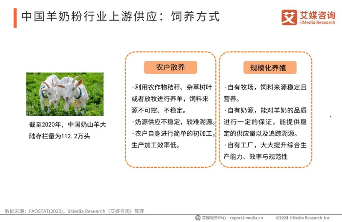 羊奶粉的主要原材料为羊乳,其中占据市场份额较多的则为奶山羊乳。数据显示,截至2020年,中国奶山羊大陆存栏数为112.2万头。奶山羊的喂养方式通常分为农户散养与规模化养殖,规模化养殖因自有牧场、自有奶源与自有工厂,大大提高了奶源生产的品质、产量与效率,目前国内奶山羊养殖规模最大的企业为盛健羊乳,拥有奶山羊基础种群位居中国第一,世界前列。