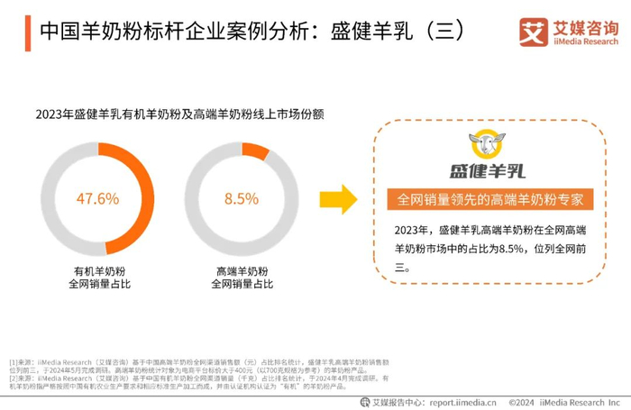 盛健羊乳通过建设现代化牧场,打造优质奶源基地,实现了全产业链的战略布局,同时持续创新研发并坚持高品质发展,稳固占据了中国羊奶粉市场的优势地位。iiMedia Research(艾媒咨询)数据显示,2023年中国高端羊奶粉线上市场中,盛健羊乳跻身前三,成为全网销量领先的高端羊奶粉专家[1]。盛健羊乳在有机赛道的深耕细作也取得了亮眼表现,其有机羊奶粉2023年线上销量份额为47.6%,位居全网有机羊奶粉销量第一[2]。