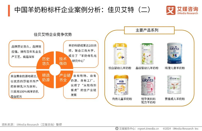佳贝艾特成立于1997年,隶属于海普诺凯乳业集团,为专攻羊奶市场的荷兰高端进口品牌,其旗下有新鲜羊奶、羊酸奶、羊乳酪、婴幼儿配方羊奶粉、中老年羊奶粉、儿童羊奶粉等系列产品。据澳优乳业公司财报,2023年佳贝艾特共实现营收为32.83亿元,海外市场营收增长44.7%。