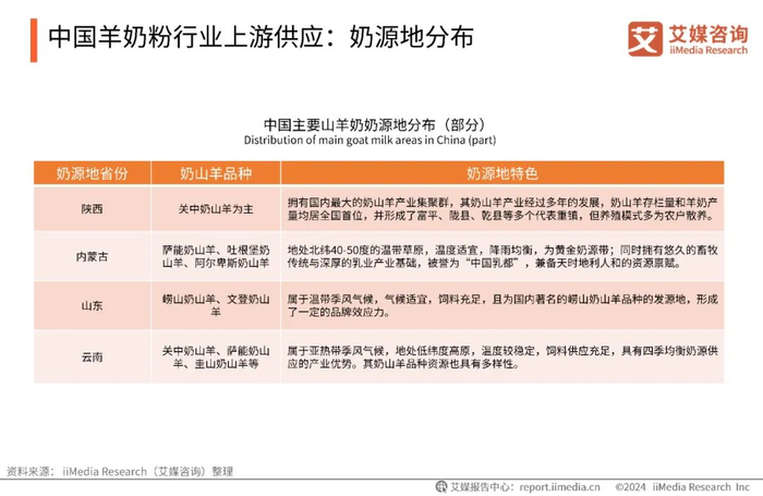数据显示,截至2024年5月,中国存续、在业的羊奶粉有关企业共2819家,羊奶粉行业巨大的市场潜力促进了相关企业的增长与发展。羊奶粉赛道中,生产的奶源地是各大品牌企业竞争的核心要素,中国的山羊奶奶源地主要分布在陕西、内蒙古、山东、云南、甘肃、安徽等地。目前为止,陕西散养奶山羊存栏量全国最多,多为农户养殖;而内蒙古处于黄金奶源地,以规模化养殖为主,逐渐成为了羊奶粉奶源生产和供应的主要地区。