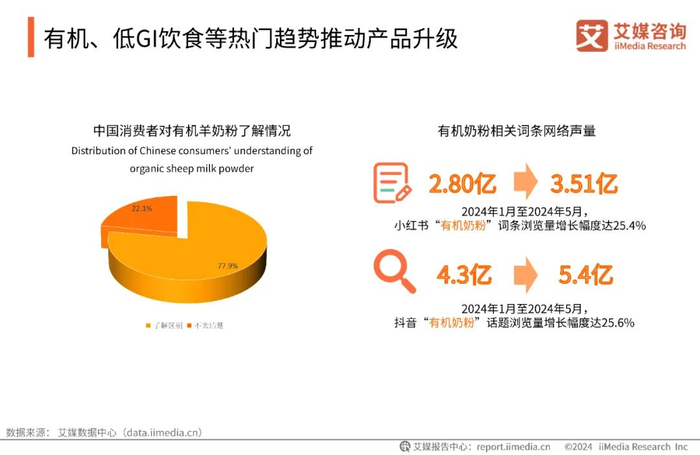 随着居民健康意识的提升,有机食品与低GI饮食正成为居民生活饮食的热门风向。数据显示,2024年5月,小红书、抖音“有机奶粉”话题浏览量分别达到3.51亿、5.4亿,较1月份增长25.4%、25.6%;“低GI饮食”方面,小红书相关词条总浏览量达到1734.55万。有机食品因环境友好、监管严格、口感更好等成为食品消费的热门趋势。而低GI饮食也因中国糖尿病与肥胖群体增多、消费者认知提高、政策与指南推荐等多方面因素,成为了时下流行的饮食潮流。羊奶粉行业正顺应有机与低GI饮食趋势,逐渐创新推出相关升级产品,提高市场竞争力。
