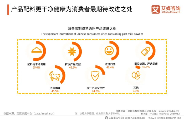 iiMedia Research(艾媒咨询)数据显示,消费者最期待羊奶粉产品改进之处分别为配料更干净健康(55.6%)、扩展产品类型(46.6%)、改进口感(46.4%)等。更为干净健康的配方仍为消费者最为追求的产品性征,羊奶粉企业应重视原料管理、科学配方、配料透明、以及持续质量检测等问题,以满足消费者日渐提高的产品标准。