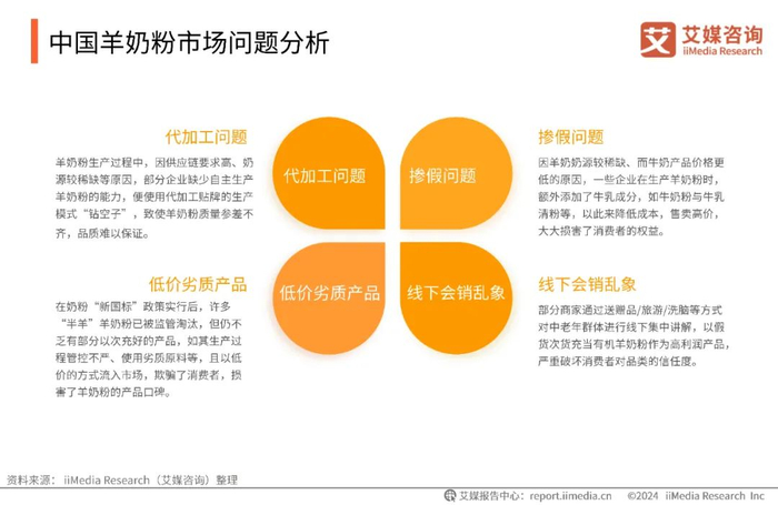 羊奶粉行业蓬勃发展、市场快速扩容的同时,一些行业乱象也随之而来,出现了一系列市场问题,如代加工生产、掺假生产、低价劣质产品流入市场、线下会销乱象等。艾媒咨询分析师认为,市场乱象仍需要市场监督管理局加强监管,坚决打击各类羊奶粉骗局,维护好消费者的切身权益。