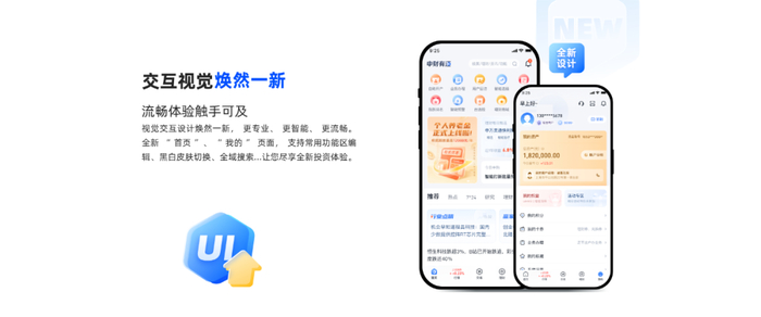 申财有道APP在视觉体验方面,采用了品牌化的设计理念,融入更年轻、更专业、更简洁的关键词,支持黑白皮肤切换、支持全域搜索、推出“我的”页面,让投资者获得更好的使用体验。