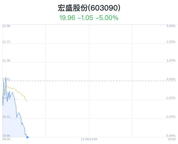 06月11日,宏盛股份(603090)股价大幅下跌,截至10点04分,宏盛股份下跌5.00%,报19.96元/股,失守20元整数关口,成交3218万元,换手率1.56%。