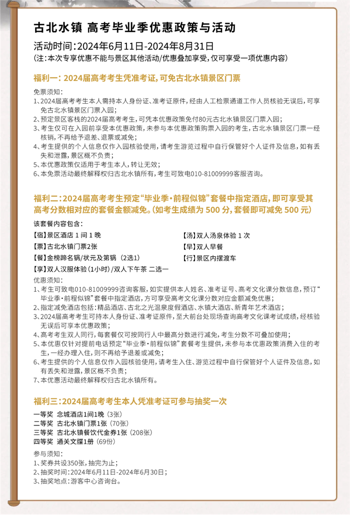 优惠政策:凡参加2024年全国高考的考生凭准考证即可享受免费入园福利,随行人员可享受景区门票8折优惠。