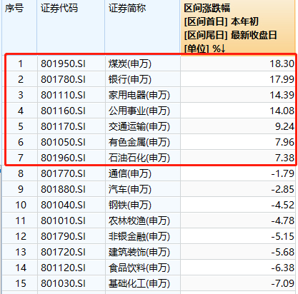 今年以来看,高股息板块持续获得资金青睐。年内涨幅靠前的银行、煤炭、家用电器、公用事业等行业均为高股息、高分红个股扎堆的行业。