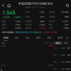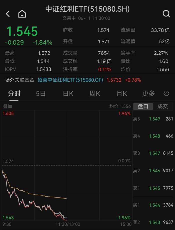 6月11日,两市核心资产回调,中证红利ETF(515080)在连续两日逆市走强背景下,今日展露出回调的态势,半日跌幅超1.80%,对于不少观望的投资者来说或也为较佳逢低买入机会。