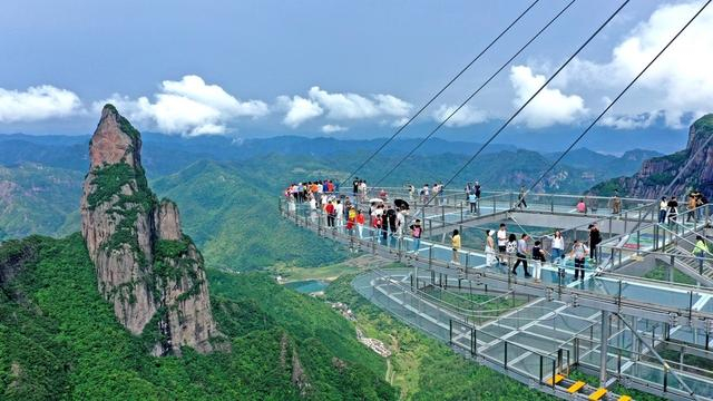 2024年6月8日,众多游人在浙江省台州市仙居县神仙居景区南天顶玻璃观景台上游玩,乐享端午假期。