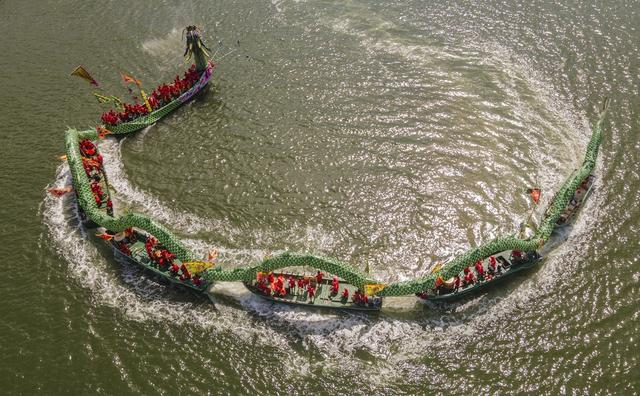 2024年6月9日,海南省万宁市,东澳镇巨龙在老爷海畅游。端午节临近,海南省万宁市老爷海热闹非凡。两条巨龙吐着水雾在小海里循环往复来回畅游,岸上锣鼓声鞭炮声和游人的喝彩声不绝于耳。据介绍,巨龙分别由东澳镇新村和龙保村民各用多条小渔船头尾相连组成,长度分别为118和138米,共耗资110多万元。