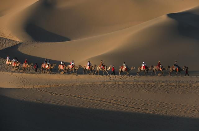 2024年6月9日,游客在甘肃省敦煌市鸣沙山月牙泉景区游览。