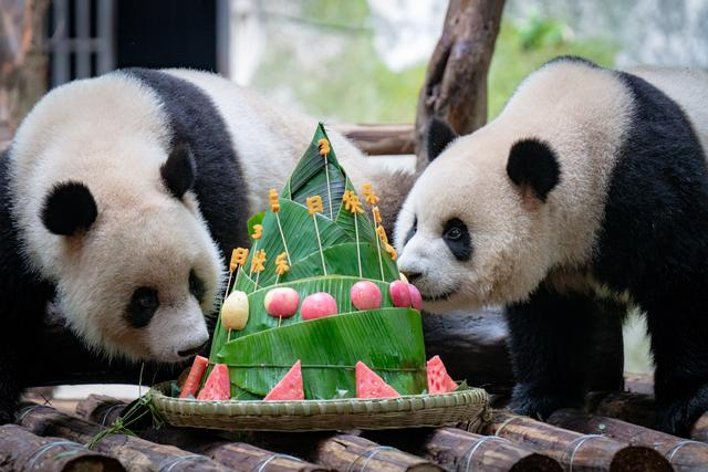 2024年6月10日,重庆动物园,大熊猫“星星辰辰”迎来三岁生日,22只国宝集体吃“粽子”蛋糕。图为大熊猫“星星“”辰辰”吃“粽子”蛋糕。