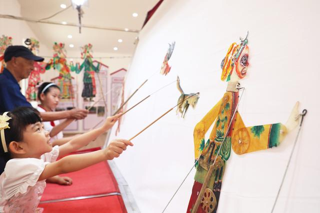 2024年6月10日,在河北省唐山市丰润区太平路街道锦祥社区,皮影艺人指导孩子们表演皮影戏。