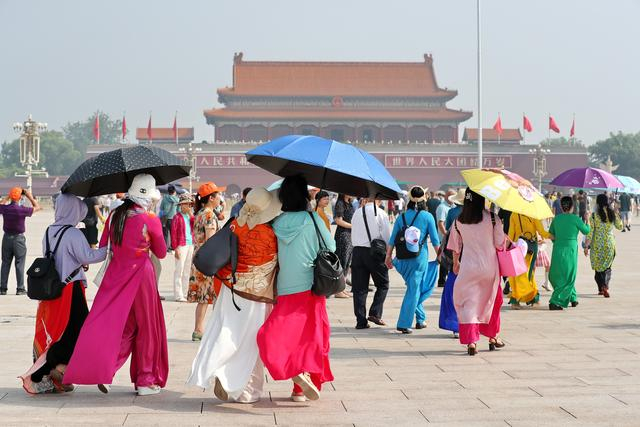 2024年6月10日,北京,游客顶烈日游览天安门广场兴致不减。当日是端午节,北京继续高温炙烤模式,紫外线照射强烈,最高气温达到35摄氏度,热力十足。在天安门广场游客纷纷撑起太阳伞抵御阳光曝晒。