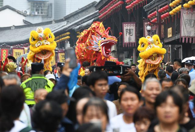 2024年6月8日,“窑火不熄·陶韵满城”千年荣昌·开窑记暨民俗文化巡游展演活动在重庆市荣昌区安陶小镇陶宝古街举行,舞龙舞狮、四川资中木偶戏、彩船舞等多项川渝民俗巡游表演吸引眼球。图为民俗文化巡游展演吸引大量游客。