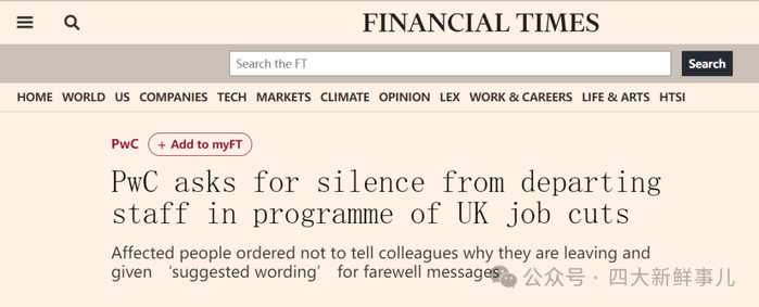 据金融时报报道,普华永道英国成员机构启动一轮“自愿离职”(即无声裁员并附带离职津贴),离职的员工被要求不得告知同事他们离职的原因,如果要发送离职相关信息,必须采用人力资源部提供的 “建议措辞”。