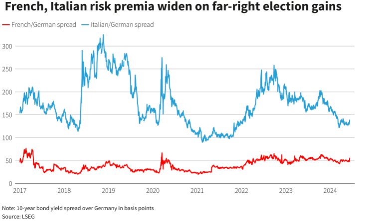 法国10年期国债收益率周一飙涨了12.8个基点报3.223%,法国/德国10年期国债收益率差也随之扩大了7个基点,至55个基点,尽管这一利差仍远低于2017年时的80个基点——当时勒庞曾誓言退出欧元区,但已经处于了近年来的高位。