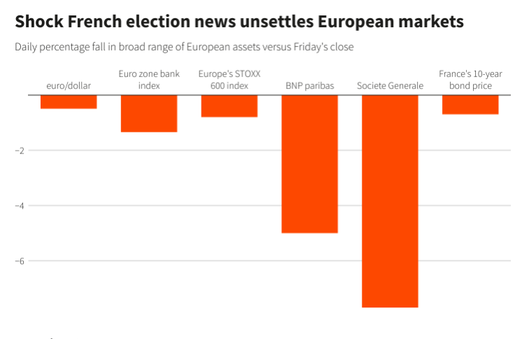 周一,欧元、法国股市和欧洲国债都遭遇到了猛烈抛售,因投资者正纷纷评估由勒庞和其接班人巴尔德拉领导的法国极右翼阵营,是否能在接下来法国大选中再次取得成功?同时各国极右翼政党对新一届欧盟行政机构的影响力,又究竟会有多大?