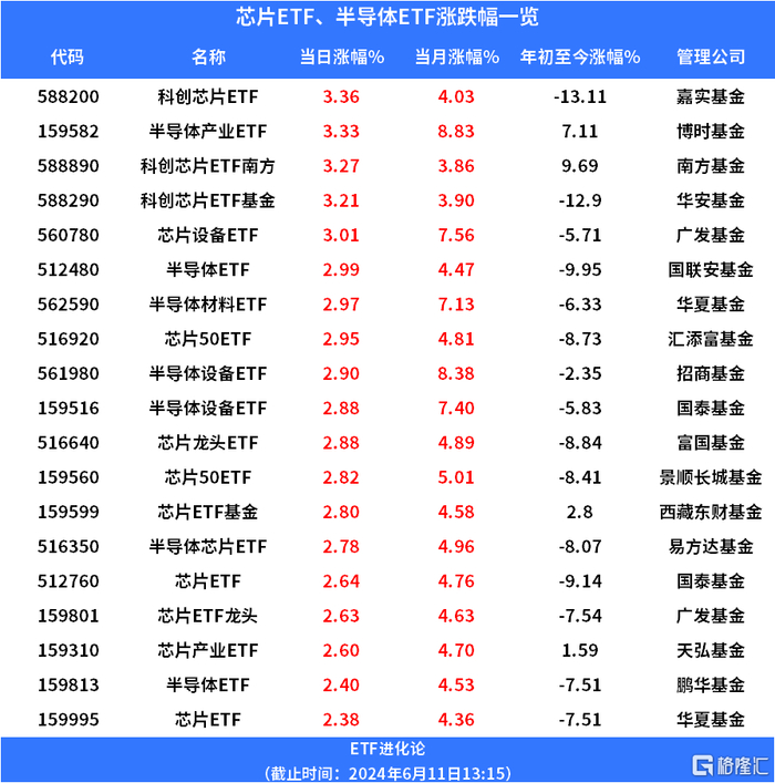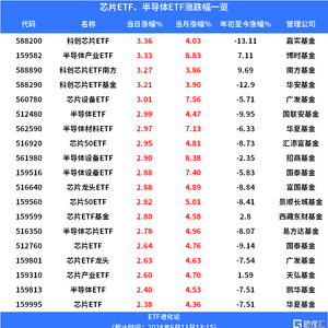 半导体产业链集体冲高,截至13:15,嘉实基金科创芯片ETF、博时基金半导体产业ETF、南方基金科创芯片ETF南方、华安基金科创芯片ETF基金、广发基金芯片设备ETF涨超3%;国联安基金半导体ETF、华夏基金半导体材料ETF、汇添富基金芯片50ETF、招商基金半导体设备ETF、国泰基金半导体设备ETF、富国基金芯片龙头ETF、景顺长城基金芯片50ETF、西藏东财基金芯片ETF基金、易方达基金半导体芯片ETF、国泰基金芯片ETF、广发基金芯片ETF龙头、天弘基金芯片产业ETF、鹏华基金半导体ETF、华夏基金芯片ETF涨超2.3%。