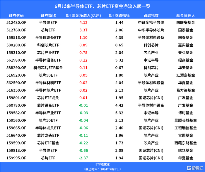 截至6月7日,6月以来超7亿资金净流入半导体、芯片相关ETF。具体来看,超4亿资金流入国联安基金半导体ETF,超3亿资金流入国泰基金芯片ETF,超1亿资金流入国泰基金半导体设备ETF。