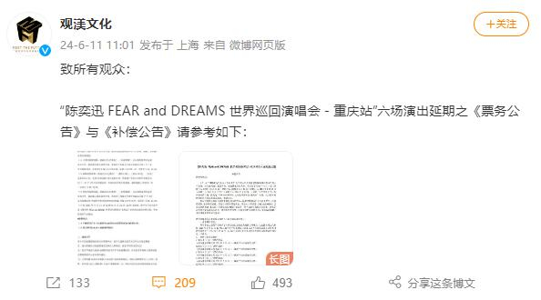 上述公告还提及,陈奕迅目前状况稳定,需继续留院接受治疗护理,请大家放心。同时,主办方也发布了重庆站六场演出延期的《票务公告》与《补偿公告》。