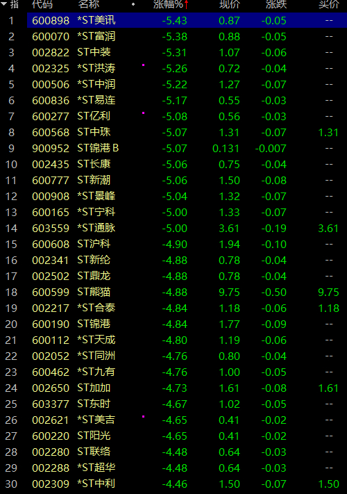 ST股继续大分化也引起了市场的关注,一边是*ST开元、ST聆达、*ST巴安、*ST迪威等约20股涨停;另一边是*ST美讯、*ST富润、ST中装、*ST洪涛等超30股的跌停。
