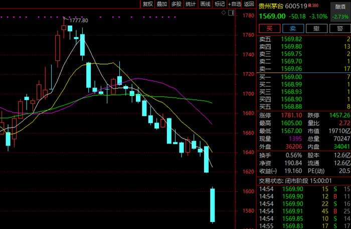 今日,白酒股的下跌,成为制约大盘走强的重要因素之一。白酒板块指数放量跳空低开低走,跌2.82%,创4个多月来新低。贵州茅台全天走弱,跌破1600元,逼近年内最低点,成交110.9亿元,较前一交易日激增1倍多,市值一日损失逾632亿元;泸州老窖、迎驾贡酒、五粮液等同样低开低走放量下挫。