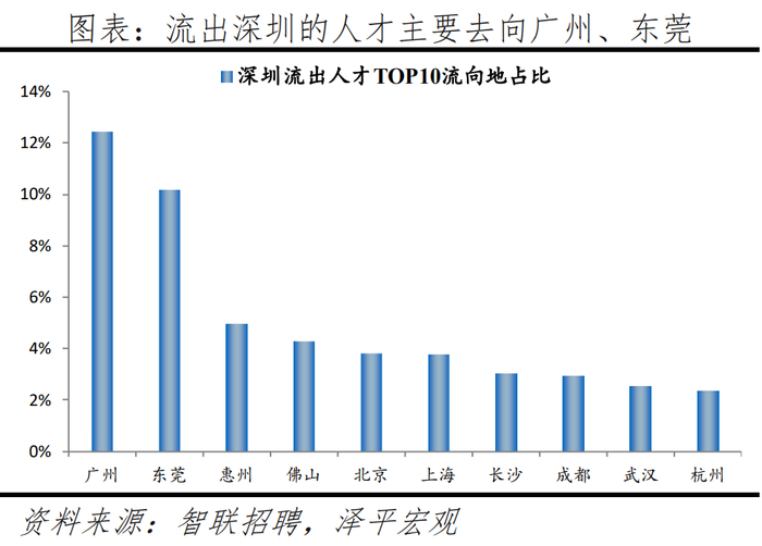 从来源看,2023年人才流向深圳的前十大城市合计占比39%,低于2022年前十来源地的41.1%,深圳的人才来源集中度下降。其中,珠三角城市下降至3个,合计占比18.2%。流入深圳的人才中10%来自广州,流入广州的人才中9.6%来自深圳,深圳和广州互为人才来源城市的第1位。人才流入深圳主要因为经济发展速度较快,2023年深圳GDP达3.5万亿,位居全国第3。叠加拥有低于北京和上海的落户门槛,以及创新的产业结构,提供较多工作岗位,能吸引更多人才到深圳就业。