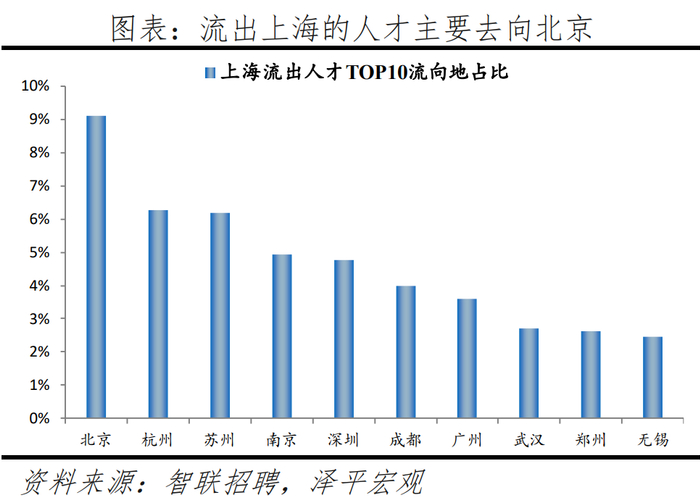 从来源看,2023年人才流向上海的前十大城市合计占比36.1%,低于2022年的37.9%,上海人才来源集中度有所下降。其中,长三角城市有3个,合计占比10.5%。人才流入上海主要因为上海的经济体量大、薪酬水平高,新经济促进政策初见成效且上海放宽人才引进政策。2023年上海GDP规模达4.72万亿元,城镇人均可支配收入8.9万元,均位列全国第一。根据上海市经济和信息化委员会数据,2023年上海的中国互联网百强企业数为17家,位居全国各省市第2位,“在线新经济”发展效果明显。2022年上海人才落户条件放宽,高层次人才、重点机构急需人才、高技能人才等5类人才可直接落户上海,申办公示期由15天减少至5天。此外,对于留学生,针对毕业于世界排名前50名院校的留学回国人员,取消社保缴费基数和缴费时间要求,全职来沪工作后即可直接落户;毕业于世界排名51—100名的,全职来沪工作并缴纳社保满6个月后可申办落户。整体看,落户政策相对北京更宽松、流程更简化,更能吸引年轻优秀人才来沪就业。