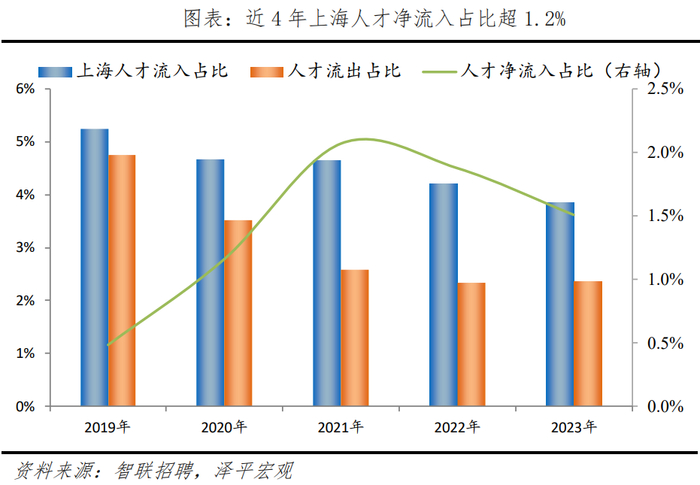 从人才流入流出占比看,2019-2023年上海人才流入占比从5.2%降至3.9%。2023年人才流入占比较2022年小幅下降0.3个百分点,而人才流出占比保持稳定,为2.3%,因此净流入占比小幅下降。