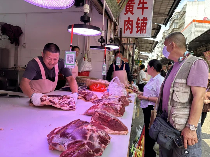 6月4日上午,宏海菜市场内买菜的市民络绎不绝,不少市民纷纷赶早前来挑选新鲜的肉类,相比猪肉区,购买牛肉的人挤满了摊位。