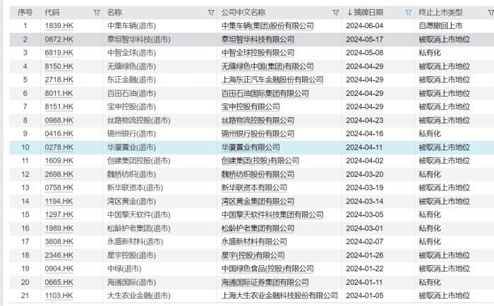 Wind数据显示,截止到6月11日,港股今年退市的公司有21家。其中,私有化7家,被取消上市地位有13家,一家为自愿撤回上市。相比之下,2023年退市的港股企业为58家,2022年为64家,均保持高位。
