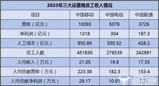 数据显示,中国移动2023年营收为10093亿元,净利润1318亿元,员工薪酬支出总额为950.89亿元,员工总数是451830人,人均收入21.05万元,人均贡献营收223.38万元,人均贡献净利润29.17万元。