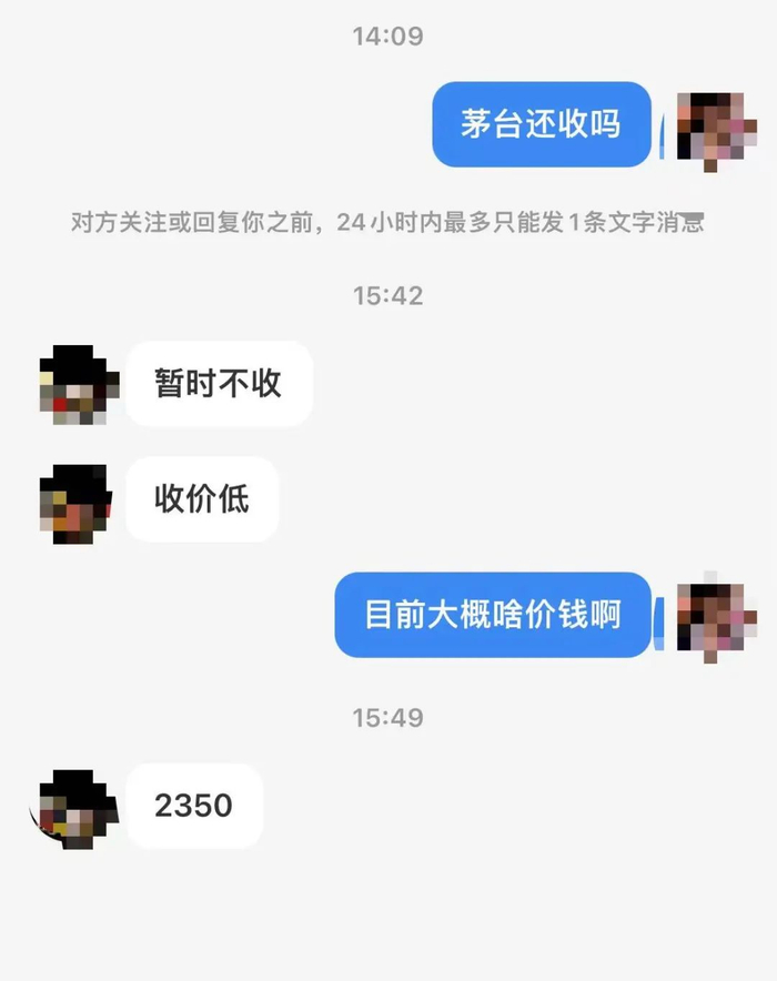 蓝鲸记者采访多位黄牛得知,目前由于茅台价格大跌,不少黄牛已经暂停回收相关产品,“即便收价格也不高,2300元左右,几乎天天跌,再跌下去都砸手里了。”