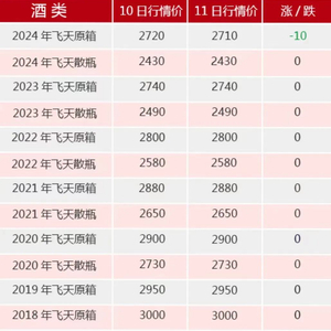由于茅台官方购买渠道数量和商品数量非常有限,因此以官方正价买到茅台的概率并不高,多数在市场中流通的茅台酒通常都有一定程度的溢价。根据不二酱平台数据,6月11日2024年飞天茅台散瓶行情价位2430元,较年初价格跌去近300元。