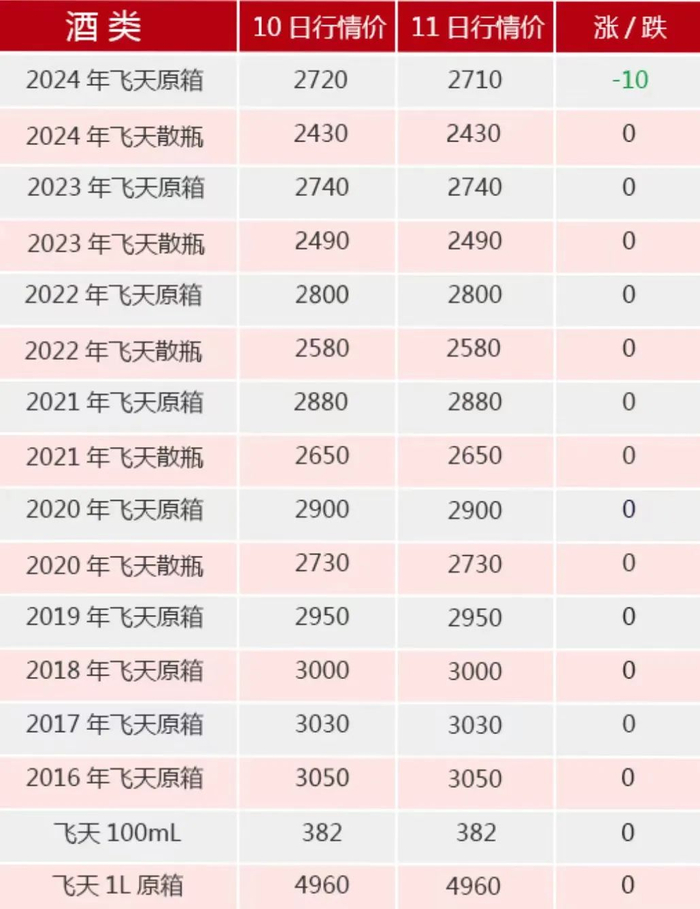 今年端午节前后,茅台酒(53度 500ml)批价持续下跌。据今日酒价数据,今年以来,茅台酒批价已由年初2700元/瓶左右,跌至2445元/瓶左右。据不二酱平台发布的数据,2023—2024年原箱跌5元—10元/瓶,2024年散瓶跌价40元/瓶;兔年、虎年、猪年跌价30元—50元/瓶,鼠年和猴年暴跌100元—200元/瓶;其他系列,三十年跌100元/瓶。