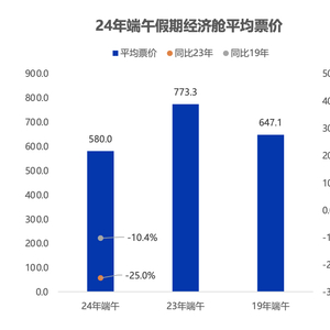 上述预期也令端午期间的机票价格保持“温和”。根据航班管家的统计数据,端午节期间的国内机票(经济舱)均价580元,同比2019年下降10.4%,同比2023年也下降25.0%。