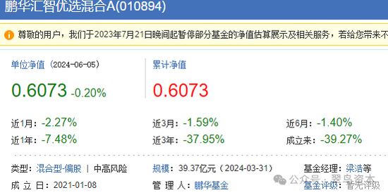 据了解,梁浩旗下有一只“鹏华汇智优选混合”的产品,规模在其产品线中居前,最新净值在0.60元附近徘徊,如下图所示: