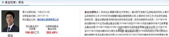 据天天基金网,梁浩是鹏华基金目前规模最高的权益基金经理,截至2024年一季度末管理高达106.65亿元公募资产。