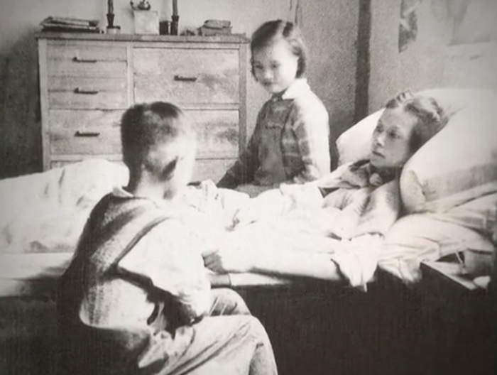 林徽因与病床上的梁思成讨论国徽设计方案