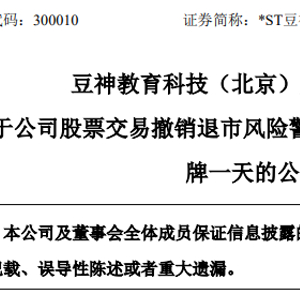 6月11日晚间,*ST豆神、ST天顺两家公司发布撤销退市警示公告,并将于6月12日停牌一天,于6月13日开市起撤销其他风险警示并恢复交易。